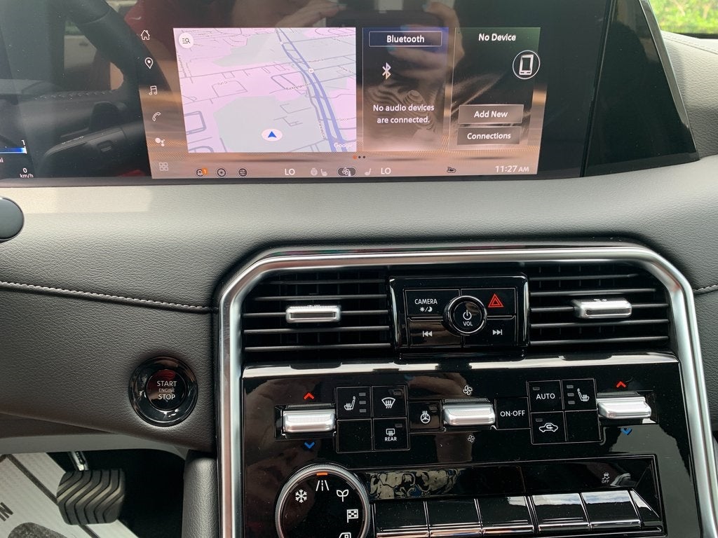 12 Speakers, 20 Painted Alloy Wheels, 3rd row seats: split-bench, 4-Wheel Disc Brakes, ABS brakes, Air Conditioning, Alloy wheels, AM/FM radio: SiriusXM, Anti-whiplash front head restraints, Auto High-beam Headlights, Auto tilt-away steering wheel, Auto-dimming door mirrors, Auto-dimming Rear-View mirror, Auto-leveling suspension, Automatic temperature control, Brake assist, Bumpers: body-color, Delay-off headlights, Driver door bin, Driver vanity mirror, Dual front impact airbags, Dual front side impact airbags, Electronic Stability Control, Emergency communication system: NissanConnect Services, Four wheel independent suspension, Front anti-roll bar, Front Bucket Seats, Front Center Armrest, Front dual zone A/C, Front reading lights, Fully automatic headlights, Garage door transmitter: myQ Connected Garage, Genuine wood dashboard insert, Heated door mirrors, Heated Front Bucket Seats, Heated front seats, Heated steering wheel, HVAC memory, Illuminated entry, Knee airbag, Leather steering wheel, Low tire pressure warning, Memory seat, Navigation System, Occupant sensing airbag, Outside temperature display, Overhead airbag, Overhead console, Panic alarm, Passenger door bin, Passenger vanity mirror, Power door mirrors, Power driver seat, Power Liftgate, Power passenger seat, Power steering, Power windows, Radio: NissanConnect w/SiriusXM 360L, Rain sensing wipers, Rear air conditioning, Rear anti-roll bar, Rear reading lights, Rear seat center armrest, Rear window defroster, Rear window wiper, Reclining 3rd row seat, Remote keyless entry, Security system, Speed control, Speed-sensing steering, Speed-Sensitive Wipers, Split folding rear seat, Spoiler, Steering wheel memory, Steering wheel mounted audio controls, Tachometer, TailorFit Seat Trim, Telescoping steering wheel, Tilt steering wheel, Traction control, Trip computer, Turn signal indicator mirrors, Variably intermittent wipers, and Voltmeter.
