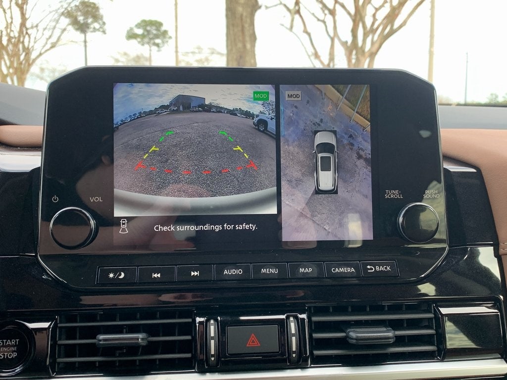 Cargo Package (Cargo Area Protector, Cargo Net, and First Aid), 13 Speakers, 3rd row seats: bench, 4-Wheel Disc Brakes, ABS brakes, Air Conditioning, Alloy wheels, AM/FM radio: SiriusXM, Auto High-beam Headlights, Auto tilt-away steering wheel, Auto-dimming Rear-View mirror, Automatic temperature control, Bench Seat Carpeted Floor Mats (set of 4), Black Splash Guards (set of 4), Bodyside moldings, Bose Premium Audio System, Brake assist, Bumpers: body-color, Climate Controlled Front Bucket Seats, Cross Bars, Delay-off headlights, Driver door bin, Driver vanity mirror, Dual front impact airbags, Dual front side impact airbags, Electronic Stability Control, Emergency communication system, Exterior Parking Camera Rear, Four wheel independent suspension, Front anti-roll bar, Front Bucket Seats, Front Center Armrest, Front dual zone A/C, Front reading lights, Fully automatic headlights, Garage door transmitter: HomeLink, Heads-Up Display, Heated door mirrors, Heated front seats, Heated rear seats, Heated steering wheel, Illuminated entry, Knee airbag, Leather steering wheel, LED Fog Lamps, Low tire pressure warning, Memory seat, Navigation system: NissanConnect with Navigation and Services, Nissan USB Charging Cable Set, NissanConnect featuring Apple CarPlay and Android Auto, NissanConnect with Navigation and Services, Occupant sensing airbag, Outside temperature display, Overhead airbag, Overhead console, Panic alarm, Passenger door bin, Passenger vanity mirror, Power door mirrors, Power driver seat, Power Liftgate, Power moonroof, Power passenger seat, Power steering, Power windows, Radio data system, Radio: AM/FM Audio System, Rain sensing wipers, Rear air conditioning, Rear anti-roll bar, Rear reading lights, Rear seat center armrest, Rear side impact airbag, Rear window defroster, Rear window wiper, Reclining 3rd row seat, Remote keyless entry, Security system, Semi-Aniline Leather-Appointed Seating Surfaces, Speed control, Speed-sensing steering, Speed-Sensitive Wipers, Split folding rear seat, Spoiler, Steering wheel memory, Steering wheel mounted audio controls, Tachometer, Telescoping steering wheel, Tilt steering wheel, Traction control, Trip computer, Turn signal indicator mirrors, Variably intermittent wipers, Ventilated front seats, and Wheels: 20 x 8J Machined Alloy. 20/27 City/Highway MPG