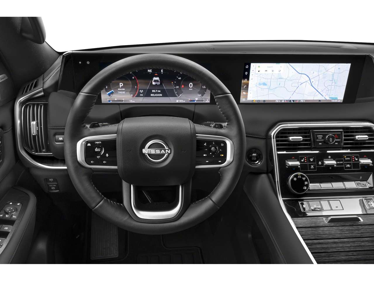 Captain's Chair Seat Package (2nd Row Center Console with Two Cupholders, 2nd Row Outboard Captain's Chairs with Armrests, and EZ Flex Second Row Seating System with One Touch Release), 12 Speakers, 3rd row seats: split-bench, 4-Wheel Disc Brakes, ABS brakes, Air Conditioning, Alloy wheels, AM/FM radio: SiriusXM w/360L, Anti-whiplash front head restraints, Apple CarPlay/Android Auto, Auto High-beam Headlights, Auto tilt-away steering wheel, Auto-dimming door mirrors, Auto-dimming Rear-View mirror, Auto-leveling suspension, Automatic temperature control, Brake assist, Bumpers: body-color, Carpeted Floor Mats with Captain Chairs, Center Front Spoiler, Compass, Cross Bars, Delay-off headlights, Driver door bin, Driver vanity mirror, Dual front impact airbags, Dual front side impact airbags, Electronic Stability Control, Emergency communication system: NissanConnect Services, Four wheel independent suspension, Front anti-roll bar, Front Bucket Seats, Front Center Armrest, Front dual zone A/C, Front reading lights, Fully automatic headlights, Garage door transmitter: myQ Connected Garage, Genuine wood dashboard insert, Heated door mirrors, Heated Front Bucket Seats, Heated front seats, Heated steering wheel, HVAC memory, Illuminated entry, Knee airbag, Leather steering wheel, Low tire pressure warning, Memory seat, Navigation system: Google Maps, Occupant sensing airbag, Outside temperature display, Overhead airbag, Overhead console, Panic alarm, Passenger door bin, Passenger vanity mirror, Power door mirrors, Power driver seat, Power Liftgate, Power passenger seat, Power steering, Power windows, Radio: NissanConnect with SiriusXM 360L, Rain sensing wipers, Rear air conditioning, Rear anti-roll bar, Rear reading lights, Rear seat center armrest, Rear window defroster, Rear window wiper, Reclining 3rd row seat, Remote keyless entry, Security system, Speed control, Speed-sensing steering, Speed-Sensitive Wipers, Splash Guards, Split folding rear seat, Spoiler, Steering wheel memory, Steering wheel mounted audio controls, Tachometer, TailorFit Seat Trim, Telescoping steering wheel, Tilt steering wheel, Traction control, Trip computer, Turn signal indicator mirrors, Variably intermittent wipers, Voltmeter, and Wheels: 20 x 8.5J Machined and Painted Alloy.
