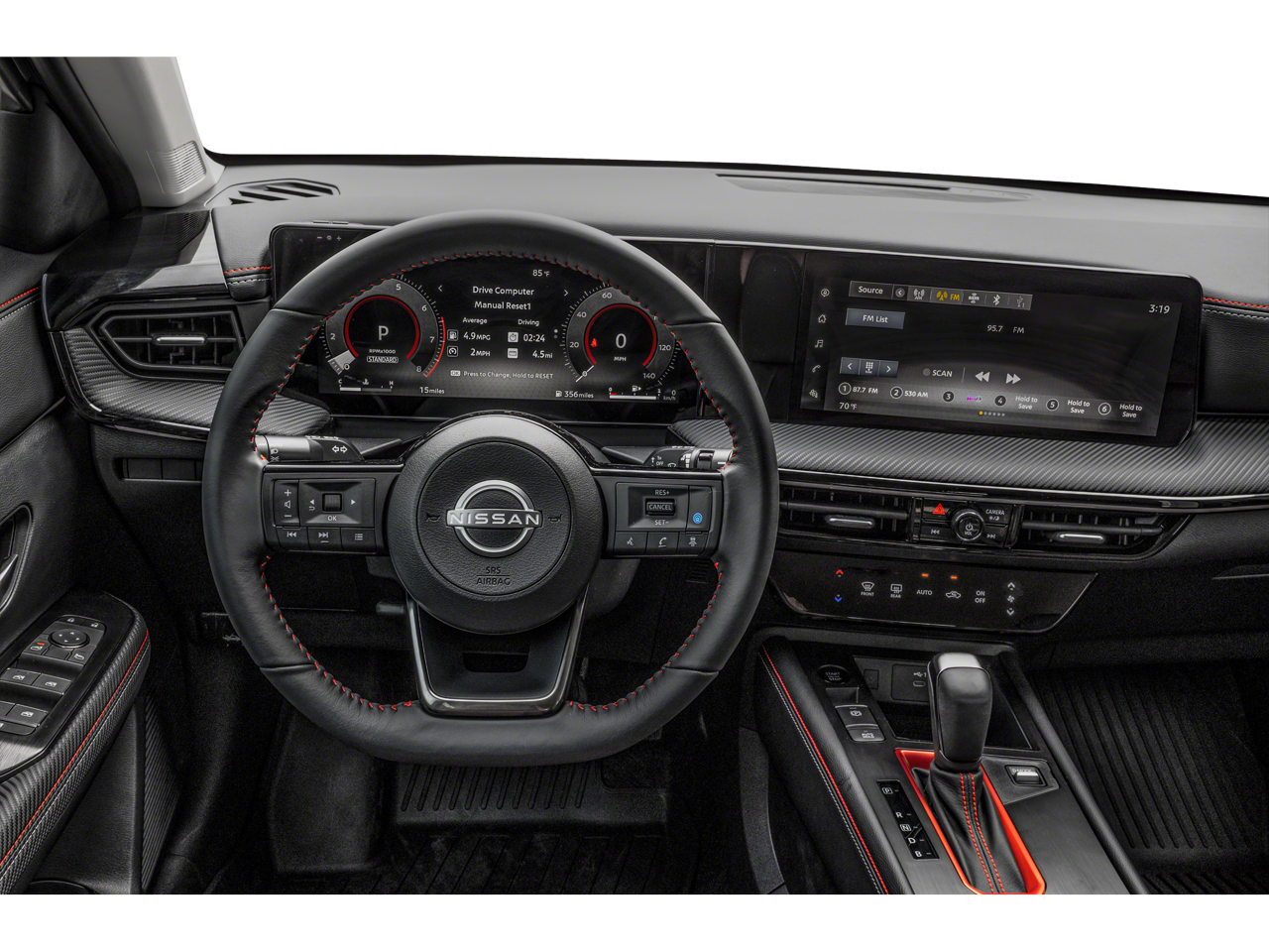 17 Alloy Wheels, 19 Alloy Wheels, 2-Tone Paint, 4-Wheel Disc Brakes, 6 Speakers, ABS brakes, Air Conditioning, Alloy wheels, AM/FM radio, Auto High-beam Headlights, Automatic temperature control, Brake assist, Bumpers: body-color, Carpeted Floor Mats & Underfloor Protector, Crossbars, Delay-off headlights, Driver door bin, Driver vanity mirror, Dual front impact airbags, Dual front side impact airbags, Electronic Stability Control, Emergency communication system: NissanConnect Services, Exterior Parking Camera Rear, Front anti-roll bar, Front Bucket Seats, Front Center Armrest, Front reading lights, Front wheel independent suspension, Fully automatic headlights, Garage door transmitter: myQ Connected Garage, Illuminated entry, Knee airbag, Leather Shift Knob, Leather steering wheel, Low tire pressure warning, NissanConnect featuring Apple CarPlay and Android Auto, Occupant sensing airbag, Outside temperature display, Overhead airbag, Overhead console, Panic alarm, Passenger door bin, Passenger vanity mirror, Power door mirrors, Power steering, Power windows, Radio data system, Radio: AM/FM/SiriusXM Audio System, Rear anti-roll bar, Rear reading lights, Rear seat center armrest, Rear side impact airbag, Rear window defroster, Rear window wiper, Remote keyless entry, Security system, Speed control, Speed-sensing steering, Splash Guards, Split folding rear seat, Spoiler, Sport Leatherette w/Cloth Insert Seat Trim, Sport steering wheel, Steering wheel mounted audio controls, Tachometer, Telescoping steering wheel, Tilt steering wheel, Traction control, Trip computer, Turn signal indicator mirrors, and Variably intermittent wipers. 28/35 City/Highway MPG
