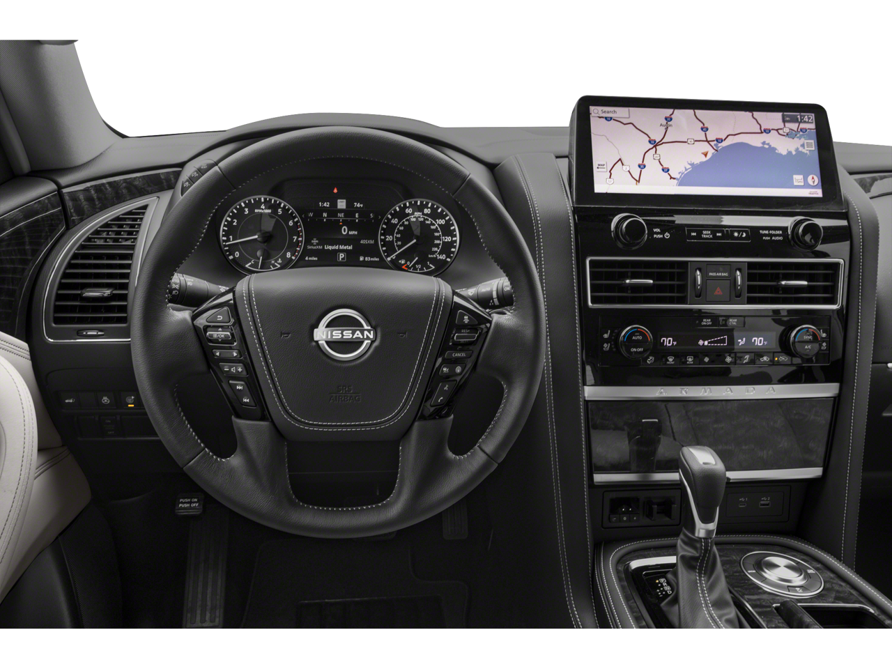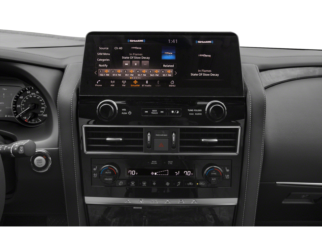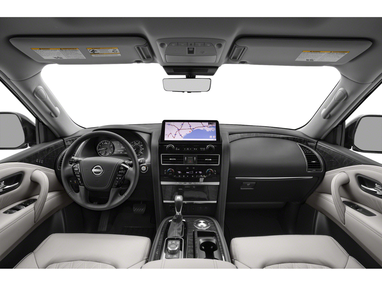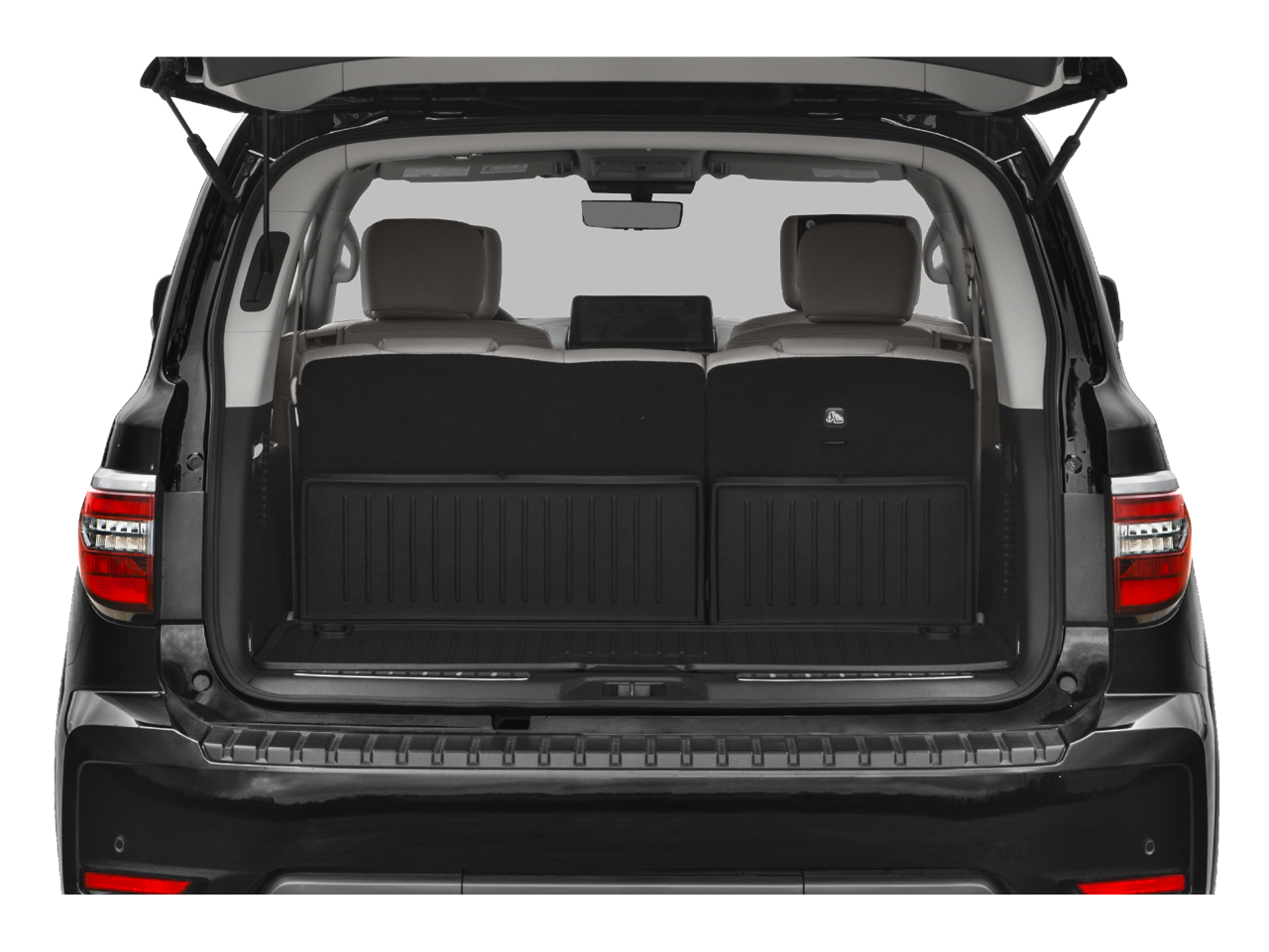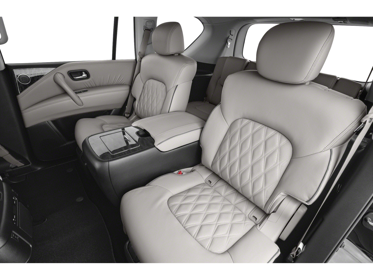 13 Speakers, 2.937 Axle Ratio, 3rd row seats: split-bench, 4-Wheel Disc Brakes, ABS brakes, Air Conditioning, Alloy wheels, AM/FM radio: SiriusXM, Anti-whiplash front head restraints, Auto High-beam Headlights, Auto tilt-away steering wheel, Auto-dimming door mirrors, Auto-dimming Rear-View mirror, Auto-leveling suspension, Automatic temperature control, Brake assist, Bumpers: body-color, Climate-Controlled Front Bucket Seats, Delay-off headlights, Driver door bin, Driver vanity mirror, Dual front impact airbags, Dual front side impact airbags, Electronic Stability Control, Emergency communication system: NissanConnect Services, Exterior Parking Camera Rear, Four wheel independent suspension, Front anti-roll bar, Front Bucket Seats, Front Center Armrest, Front dual zone A/C, Front fog lights, Front reading lights, Fully automatic headlights, Garage door transmitter: HomeLink, Heated door mirrors, Heated front seats, Heated rear seats, Heated steering wheel, HVAC memory, Illuminated entry, Knee airbag, Leather Shift Knob, Leather steering wheel, Low tire pressure warning, Memory seat, Navigation System, Occupant sensing airbag, Outside temperature display, Overhead airbag, Overhead console, Panic alarm, Passenger door bin, Passenger vanity mirror, Power door mirrors, Power driver seat, Power Liftgate, Power moonroof, Power passenger seat, Power steering, Power windows, Quilted Leather Seat Trim, Radio: NissanConnect w/SiriusXM, Rain sensing wipers, Rear air conditioning, Rear anti-roll bar, Rear reading lights, Rear seat center armrest, Rear window defroster, Rear window wiper, Reclining 3rd row seat, Remote keyless entry, Security system, Speed control, Speed-sensing steering, Speed-Sensitive Wipers, Split folding rear seat, Spoiler, Steering wheel memory, Steering wheel mounted audio controls, Tachometer, Telescoping steering wheel, Tilt steering wheel, Traction control, Trip computer, Turn signal indicator mirrors, Variably intermittent wipers, Ventilated front seats, Voltmeter, and Wheels: 22 x 8J Machine-Faced w/Tinted Clear Coat.
